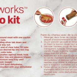 Delight family, outdoor enthusiasts or hunters with the NESCO Jerky Works Jumbo Kit original flavor seasoning that makes up to 4 lbs. of meat. Two packs of seasoning & two packs of cure are included to make fresh homemade jerky from lean ground or sliced beef, pork, turkey, or other meat. To use, simply mix the spice and cure packs with lean ground meat or add a ½ cup of water to the spice and cure when making sliced jerky. Use the included jerky gun kit to make strips or sticks or place slices onto a NESCO dehydrator or in a conventional oven for a great-tasting snack. Jerky will be ready in a matter of hours and at a fraction of the cost of store-bought. Tuck a few bags of jerky into a school backpack or camping gear for a thoughtful and tasty treat perfect for any student or sportsman. The NESCO Jerky Works Jumbo Kit Original Flavor Seasoning is gluten free and made in the USA.